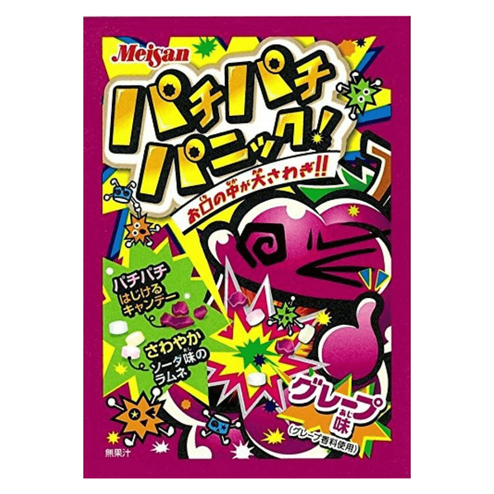 A Bala Explosiva Pachi Pachi Panic Uva da Meisan é perfeita para quem gosta de doces com personalidade! Basta colocar na boca e deixar que a combinação de grãos efervescentes com sabor de uva comece a estalar, explodir e surpreender. Ideal para consumir como lanche divertido, dividir com amigos ou presentear quem adora experiências diferentes. Uma explosão de sabor e diversão a cada pedacinho!