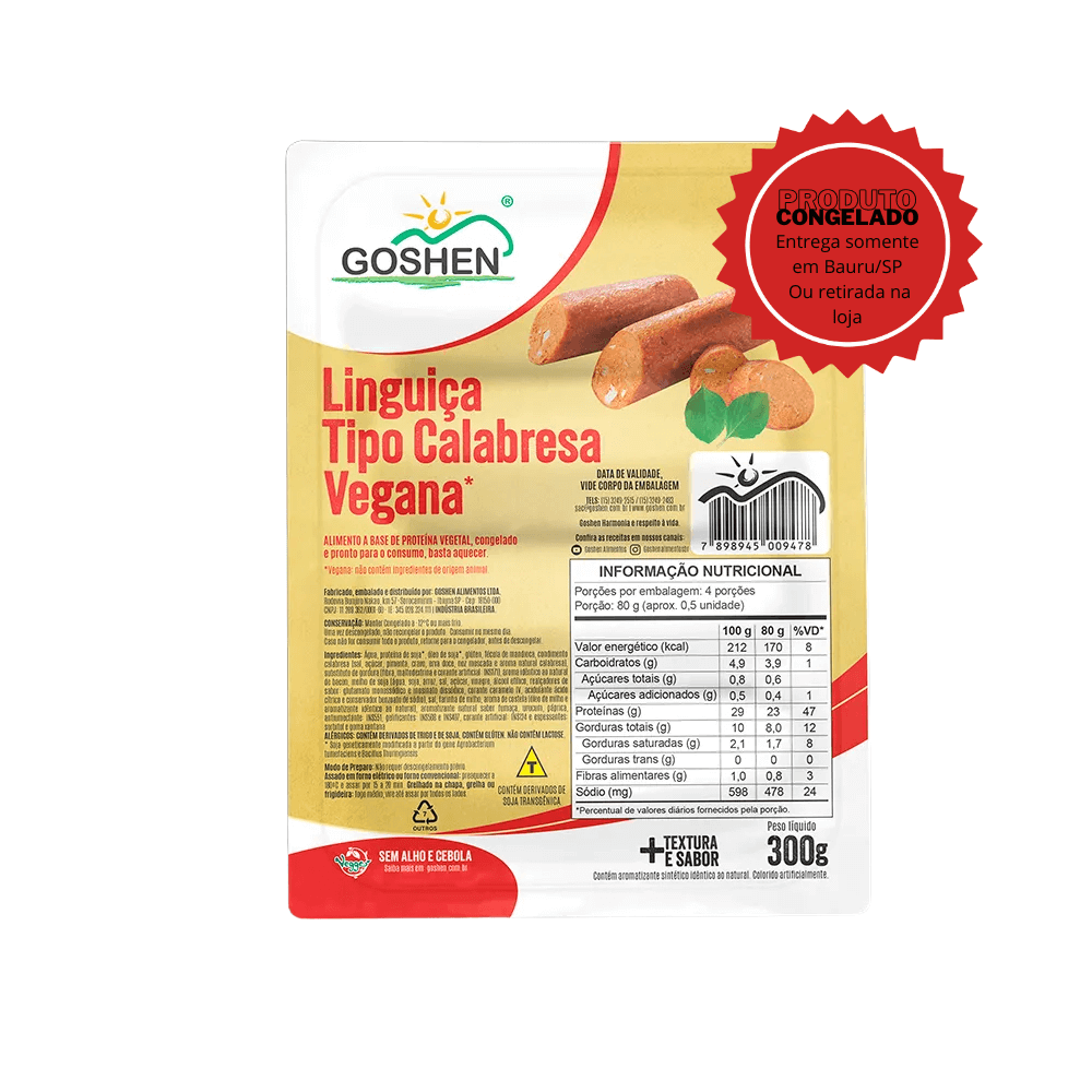 A Linguiça Tipo Calabresa Vegana Goshen 300g é uma opção vegetal perfeita para quem quer praticidade no dia a dia sem abrir mão de sabor. Produto congelado, ideal para preparar na frigideira, churrasqueira ou no forno e usar em receitas como feijoada vegana, pizzas, macarrão, farofas e lanches.