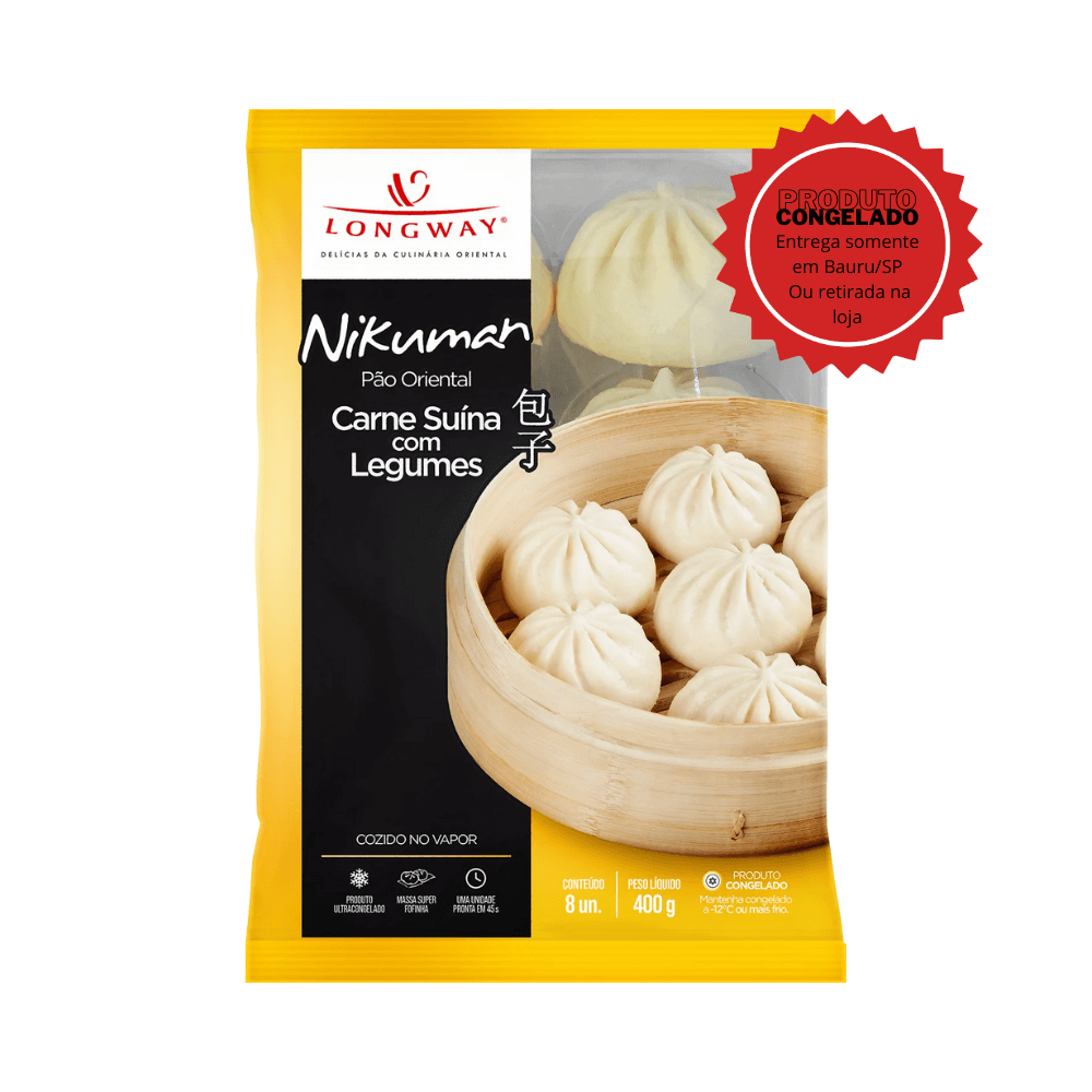 O Pão Chinês Nikuman de Carne Suína com Legumes Longway é uma opção clássica da culinária oriental, conhecido pela sua massa branca macia e pelo recheio suculento. Preparado no vapor, ele combina carne suína temperada com legumes selecionados, resultando em um sabor equilibrado e reconfortante.