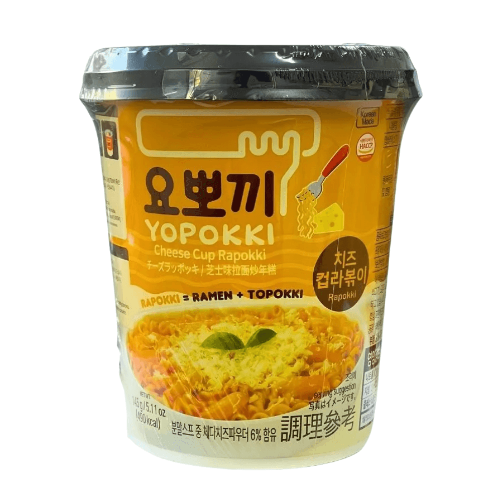 O Rapokki Cup Cheese Yopokki 145g combina dois queridinhos da gastronomia coreana: topokki (massa de arroz) e lámen, agora com um toque irresistível de queijo cremoso.